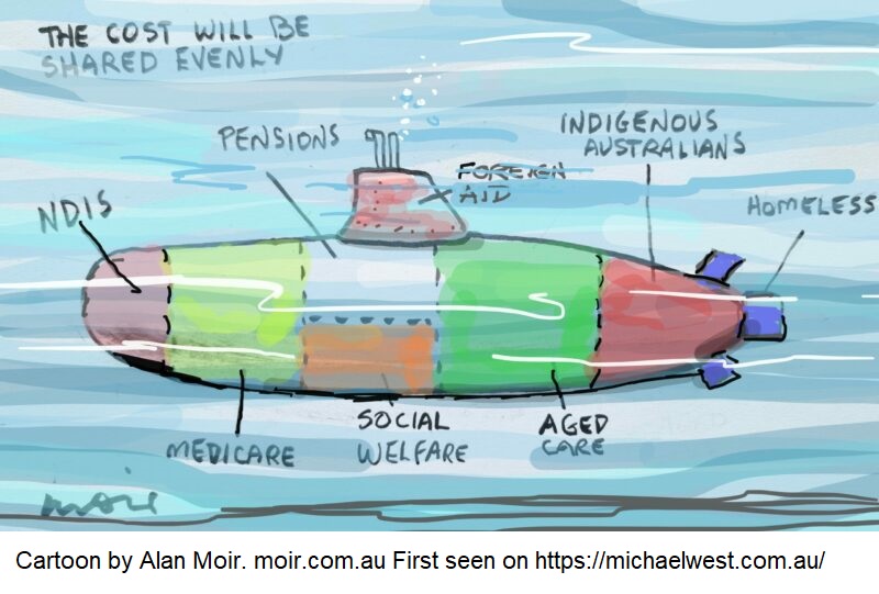 In reality it’s an agreement made without the knowledge of the Australian people, without discussion in Parliament , to make Australia pay close to $400 billion for second-hand nuclear attack submarines, including their radioactive trash.