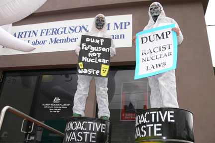 Mr Ferguson claimed that no decision had been made on a dump site. However he is pushing the National Radioactive Waste Management Bill (NRWMB) through Parliament. The Bill targets Muckaty in the NT as the only site under active consideration for a dump site despite the fact that MuckatyTraditional Owners are challenging the nomination in the Federal Court, and despite NT legislation banning the imposition of a nuclear dump. Continue reading