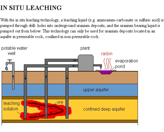 In Situ Leach mines pump highly acidic substances into an aquifer to mobilise uranium. The liquid is then pumped out of the aquifer and processed to remove the uranium. The waste liquid is then pumped back into the aquifer.