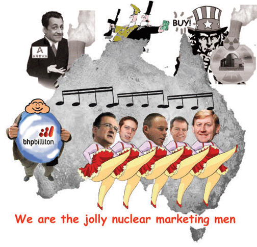 - South Australia. With BHP Billiton’s lackeys, (Mike Rann and Kevin Foley) gone, South Australian Labor and Liberal politicians are squirming around, trying to make themselves look different, more “open”. At the same time, new Premier Jay Weatherill and Liberal’s Isabel Redmond, are kow-towing to BHP Billiton, with a pretty farcical Committee study of the Roxby Downs Indenture Bill. Among other extraordinary gifts to BHP, The Bill will give away