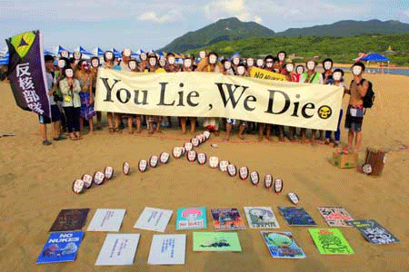 Anti-nuclear activists protest reactor at rock festival http://www.chinapost.com.tw/taiwan/local/taipei/2012/07/16/347687/Anti-nuclear-activists.htm By Kathy Chu-–Only three kilometers away from the fourth nuclear power plant, the five-day Ho-Hai-Yan Gongliao Rock Festival kicked off on 7/11 in Gonliao, New Taipei City. According to the estimate, several hundred thousand people would have swarmed to this small seaside town by the end of 7/15. About two dozen young men and women among them, however, were not there for fun; calling themselves the “Anti-Nuclear Troop,” they were there to launch a no-nuke campaign in this annual beach party.