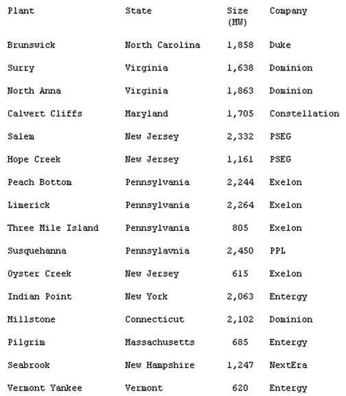 The following lists the nuclear reactors and utilities in Sandy’s potential path.