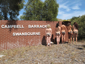 NO  MORE  WARS  –  CHEEKY PRESENCE  AT  SAS  BARRACKS, SWANBOURNE   13th November This morning a group of women bared all outside Swanbourne Barracks, headquarters of the SAS, to deliver a peaceful message in advance of the visit of Leon Panetta, United States Secretary for Defence.