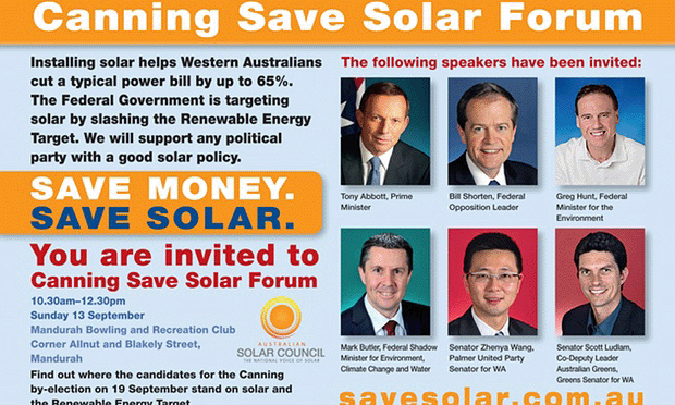 Solar Council letterboxes all electors in Western Australia’s seat of Canning encouraging them to vote for Labor, the Greens or the Palmer United party The solar