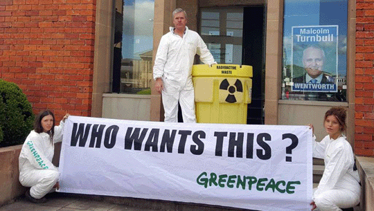 Greenpeace delivers fake nuclear waste to Malcolm Turnbull’s office, By Georgina Mitchell Celsius, 30 Oct 15, The environmental group turned up to Prime Minister Malcolm Turnbull’s electorate office in Sydney on Thursday equipped with a truck, white suits and six yellow barrels painted with radioactive symbols to deliver a message that nuclear waste is everyone’s problem.