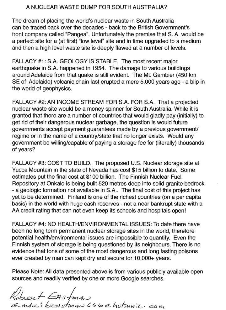Robert Eastman’s Submission to South Australia Nuclear fuel Chain Royal Commission – on the issue of Nuclear Waste Importing. Eastman provides documentary information on various requirements.