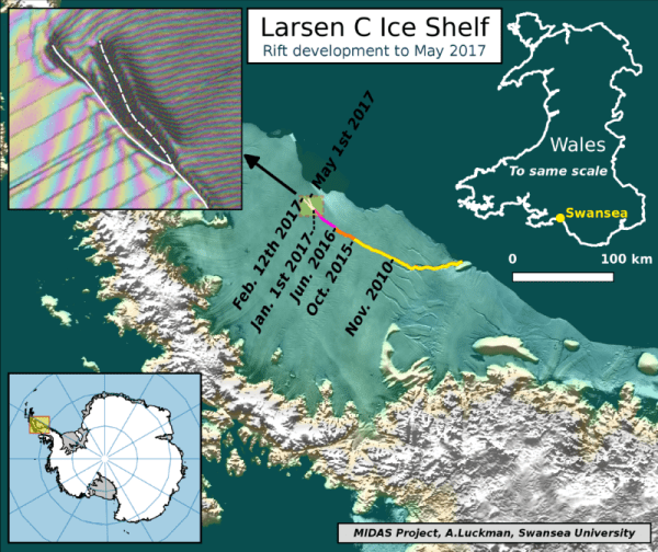 (A second crack develops in Larsen C Ice Shelf. Image source: Project MIDAS.)