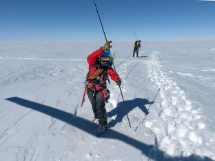In East Antarctica, Australian researchers probe for crevasses on Totten Glacier—another one that has begun to look vulnerable—before deploying instruments to measure how fast it’s moving and thinning (photo by Camille Seaman).