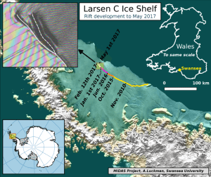 “The iceberg is one of the largest recorded and its future progress is difficult to predict,” said Adrian Luckman, professor at Swansea University and lead investigator of Project MIDAS, which has been monitoring the ice shelf for years.