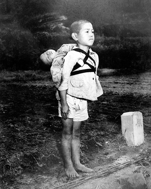 I’m attaching a picture this time – surely the saddest image from the atomic bombing of Nagasaki. A boy standing at rigid attention with the dead body of his infant brother strapped to his back at a crematorium in Nagasaki . Photographer Joe O’Donnell recalled that the boy stared motionless as bodies were being burned and he awaited his turn. He also noticed that the boy’s lips were caked with blood because he was biting them so hard, although no blood spilled.