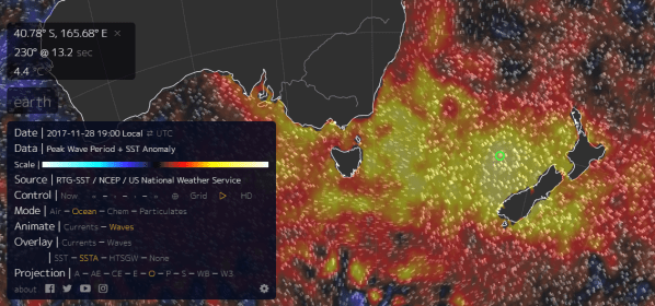 (Hot blob southeast of Australia features ocean temperatures as high as 8 F [4.5 C] above average. This is an extreme climate and severe weather-triggering feature related to climate change. One that has also been associated with strong, persistent atmospheric ridges and related high pressure systems. Image source: Earth Nullschool.)