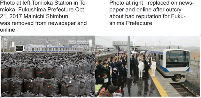 They detailed how the Mainichi Shimbun ran a story about the reopening of a stretch of railway line that had been closed since the Fukushima accident. The photo that accompanied the piece showed a train in the background. But the foreground of the picture was dominated by row after row of black trash bags filled with radioactive waste. (Shown in headline photo at the top of the article.)