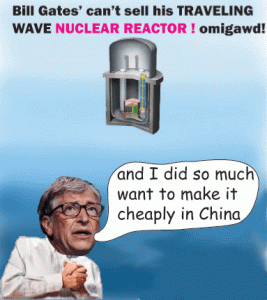 Bill Gates’s Experimental Nuclear Power Plant Halts Construction in China, Gates cites the Trump Administration’s aggressive stance for having to pull out. Popular Mechanics , By David Grossman, Jan 3, 2019 “……..Gates invested in TerraPower in 2011 with the hope of helping to prove the company’s core concept: a so-called traveling-wave reactor (TWR) which would run on depleted uranium, as opposed to the enriched uranium commonly used in nuclear plants……… In 2015, the company signed a deal with the Chinese government to be a small demonstration plant to be constructed by 2022. Since then, it has remained relatively low-profile. ……
