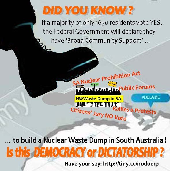 Only the residents living within the small Council areas of Kimba and Flinders Ranges have been given to opportunity to vote for or against the establishment of a Nuclear Waste Dump in South Australia. This proposal is driven by the Federal Government which, under the Radioactive Waste Management Act, have the power to override all State laws. SA Premier Steven Marshall has stated that he will back the dump if there is ‘Broad Community Support’.