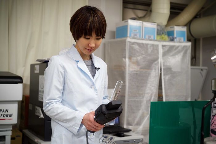 To test for caesium-137, the main long-term contaminant released from the plant, staff finely chop samples and put them inside a gamma counter, a cylindrical grey machine that looks like a centrifuge. Tarachine’s machines are more accurate than the more commonly accessible measuring tools: at some public monitoring posts, shoppers can simply place their produce on top of a device to get a reading, but this can be heavily skewed by background radiation (waving a Geiger counter over food won’t give an accurate reading for the same reason). Tarachine tries to get as precise readings as possible; the lab’s machines give results to one decimal place, and they try to block out excess background radiation by placing bottles of water around the machines.