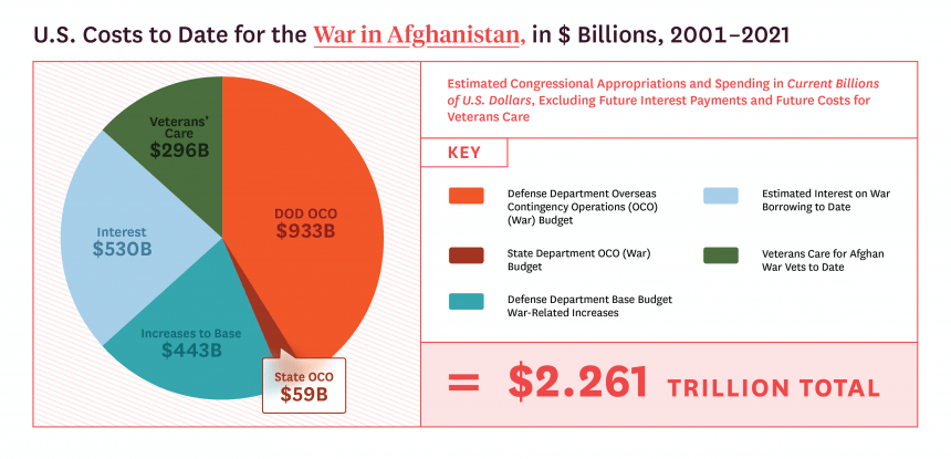 Since invading Afghanistan in 2001, the United States has spent $2.26 trillion on the war, which includes operations in both Afghanistan and Pakistan. Note that this total does not include funds that the United States government is obligated to spend on lifetime care for American veterans of this war, nor does it include future interest payments on money borrowed to fund the war.