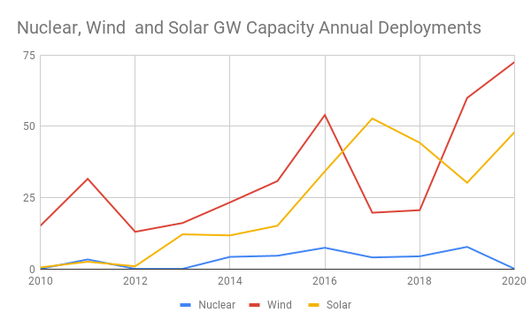 But China surprised the world in 2020, deploying not only 72 GW of wind energy, vastly more than expected, but also 48 GW of solar capacity. The wind deployment was a Chinese and global record for a single country, and the solar deployment was over 50% more than the previous year. Meanwhile, exactly zero nuclear reactors were commissioned in 2020.