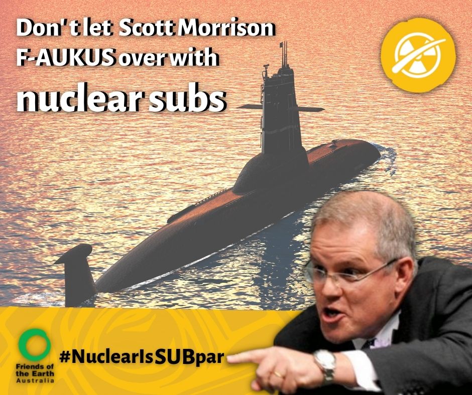 GO to https://www.foe.org.au/nonuclearsubs?fbclid=IwAR3JuFtAviP_kTDb5YX3lxHDZymQu86RWp9eW4zUWb9GV966nha3VeyFvCU The Morrison government’s decision to build nuclear submarines has shocked communities around the country.