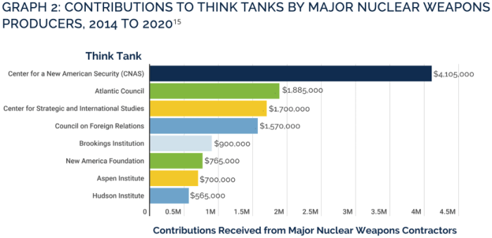 The brief also pushes back against “routinely exaggerated” claims about job creation that both companies and lawmakers use to promote nuclear weapons programs, and points out that contractors pump millions into supporting think tanks that opine on relevant policy.