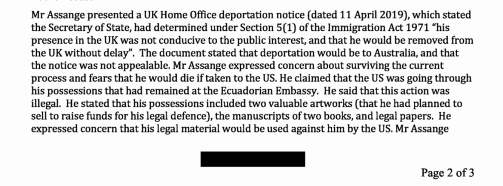 “Mr. Assange expressed concern about surviving the current process and fears he would die if taken to the US. He claimed the US was going through his possessions that had remained at the Ecuadorian Embassy. He said that this action was illegal,” the officers wrote. “He stated that his possessions included two valuable artworks he planned to sell to raise funds for his legal defence, the manuscripts of two books, and legal papers. He expressed concern his legal material would be used against him by the US.”
