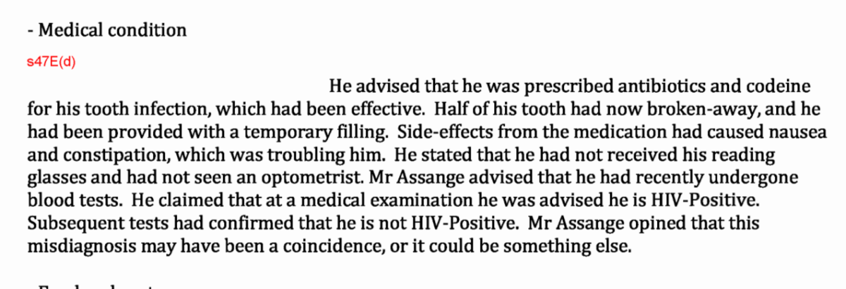 Whatever the reason for the Australian government’s foot-dragging, a consular file dated August 8th that year records how Shipton wrote to advise that Julian had been readmitted to Belmarsh’s sick bay, and a lawyer was drafting a letter to Marise Payne, requesting DFAT “use its diplomatic sources to seek an independent medical assessment (ie outside the prison).”