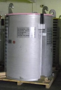 The building houses a large grayish drum-like container designed especially to store radioactive slurry. The interior of each vessel is lined with polyethylene, while its double-walled exterior is reinforced with stainless steel.