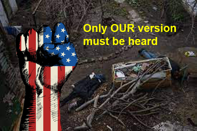 The outrage from Washington, London and Paris — “worldwide outrage,” this would be — was instant. No demand for an impartial inquiry, forensic inspections, or any such thing. No one asked why corpses left in the street for five days appeared to be fresh, or why the relatives of the dead left them there until Kiev’s commando unit arrived.