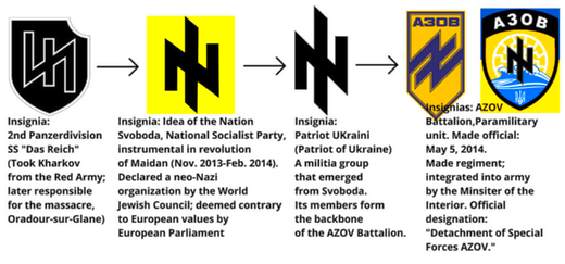 Among the many examples, that of the Azov Regiment’s insignia is instructive: see above