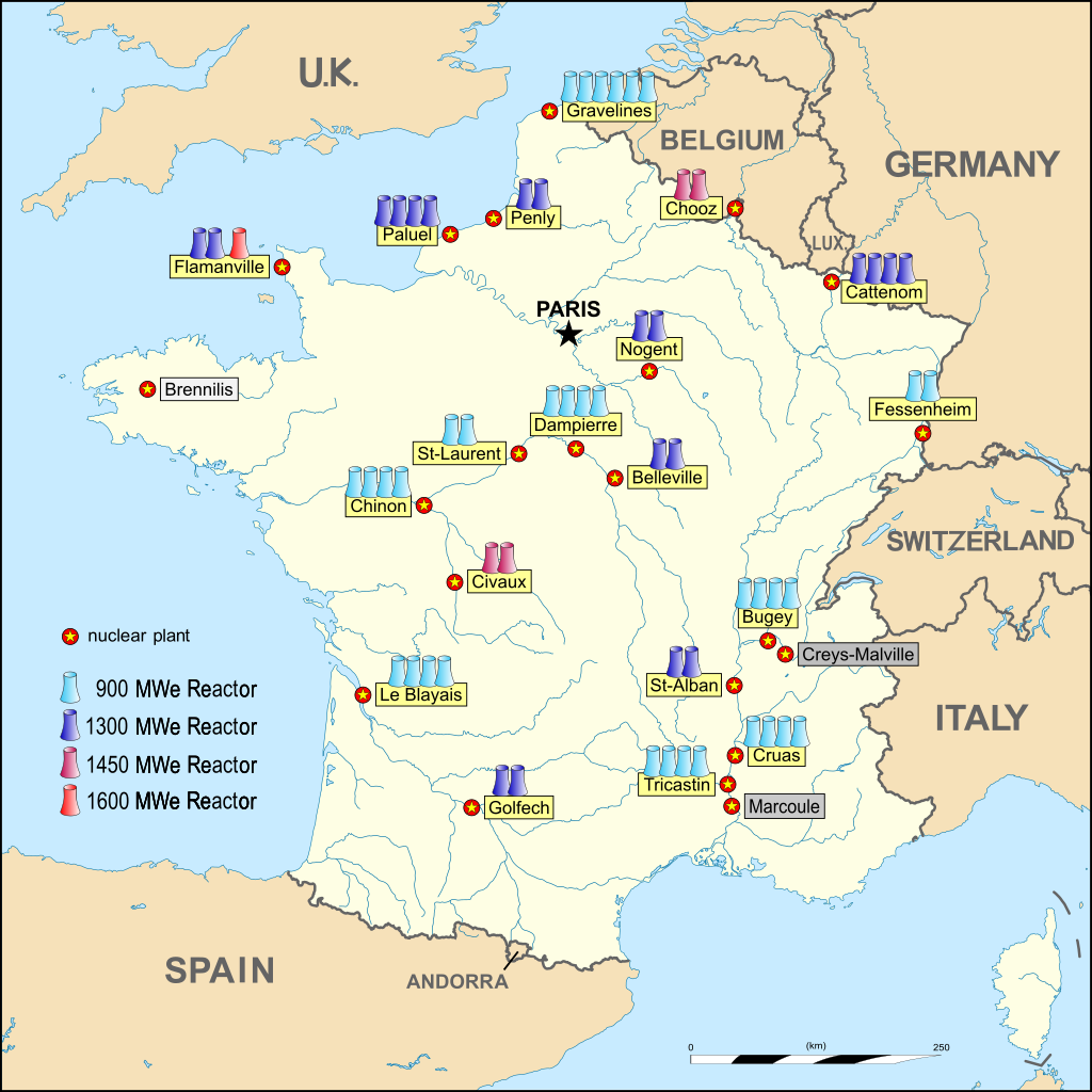 France is heavily reliant on nuclear energy. Its 56 commercial reactors dot almost every corner of the country, providing 70% of all electricity consumed. France also possesses a nuclear weapons arsenal, fueled by the nuclear power program that predated it.