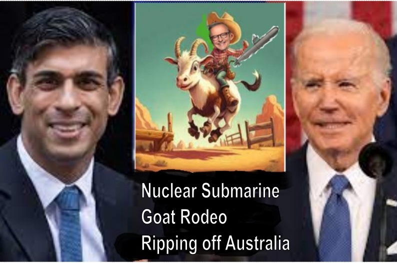 Time for an Australian Monty Python group to emerge. I mean – Scott Morrison as PM was fodder enough for humour. And he must be having a good laugh – at the trap that PM Anthony has fallen into. This latest fabulous nuclear goat rodeo* has every possible comic element – hilarious cost, unseemly wrangling USA v UK for profits, fawning Pm, lying spruiking Biden and Sunak, sceptical public……..