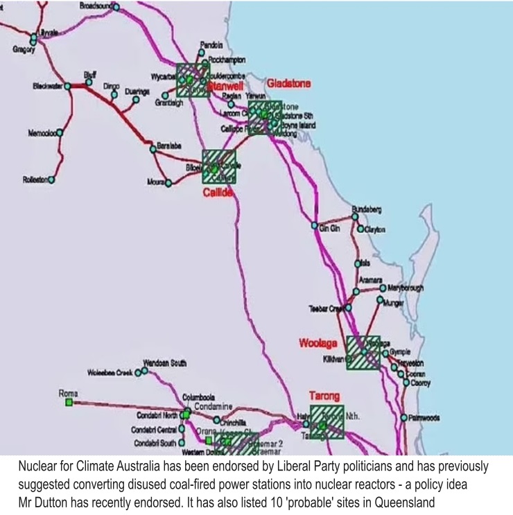 Nuclear for Climate’s 13 recommended potential reactor sites include seven existing coal-fired power stations: Callide, Stanwell, Tarong, Gladstone, Millmeran, Kogan Creek and Collinsville, along with gas-fired Swanbank in suburban Ipswich.