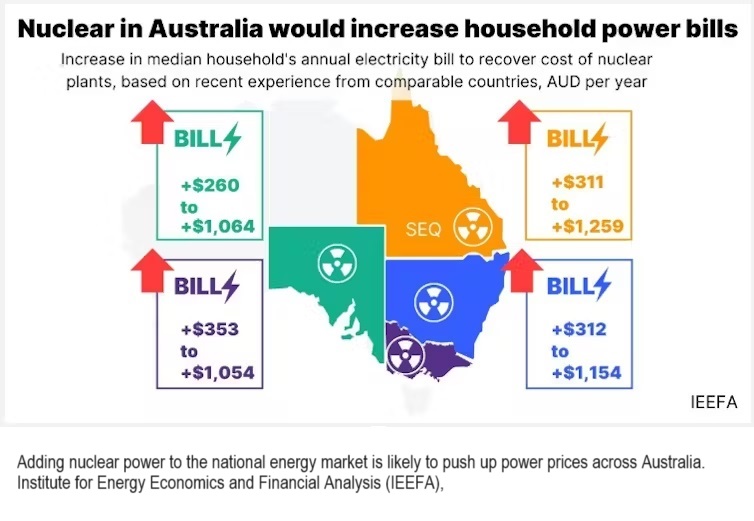 Analysis also suggests the Coalition’s plan will not reduce consumers’ power bills. The Institute for Energy Economics and Financial Analysis found household electricity bills could rise by $665 a year, on average, if nuclear energy were introduced in Australia. For a four-person household, the bill rise would be $972 a year.
