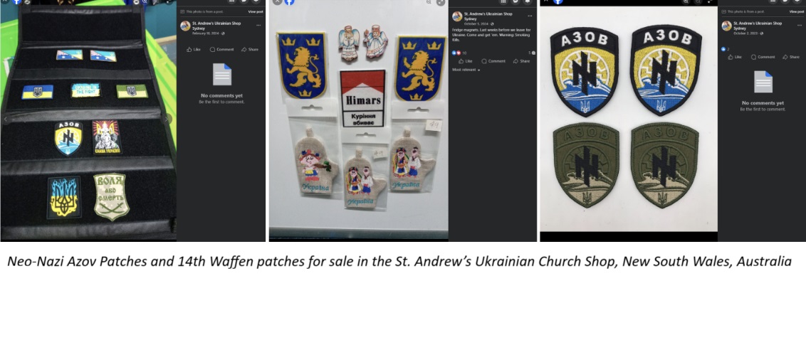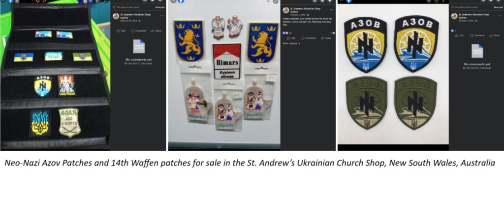 The Ukrainian church store frequently sells patches for both the 14th Waffen SS and the neo-Nazi Azov Battalion featuring the Sonnenrad symbol, the shop’s patron even participated in a parade in Ukraine in patches of the SS Battalion.
