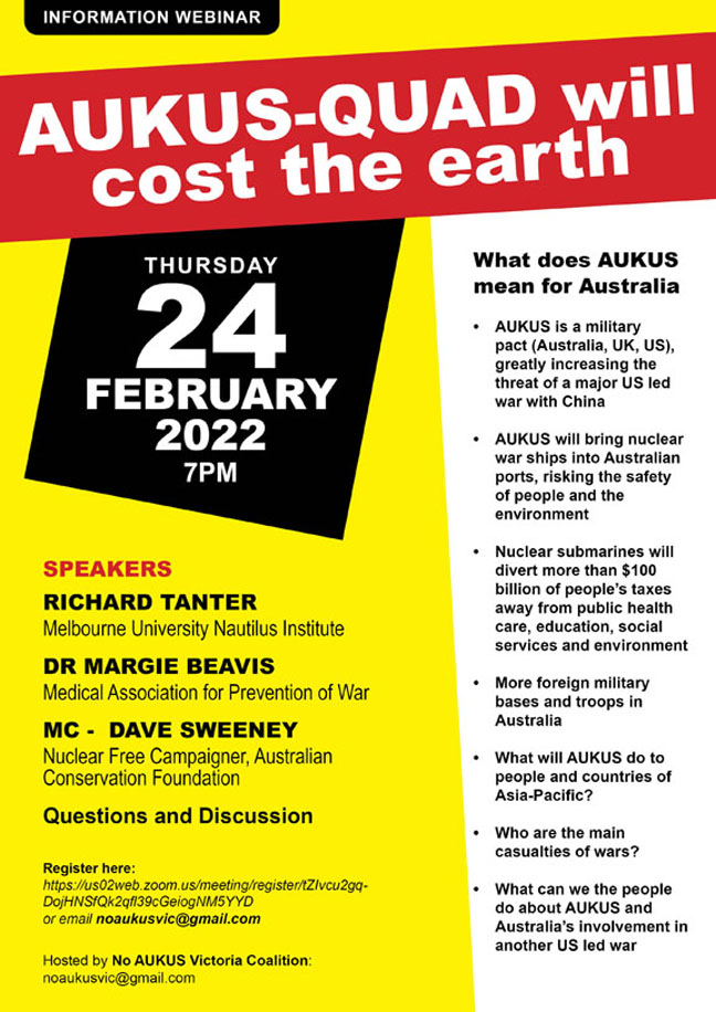 INVITATION TO WEBINAR – AUKUS WILL COST THE EARTH – 24 February
