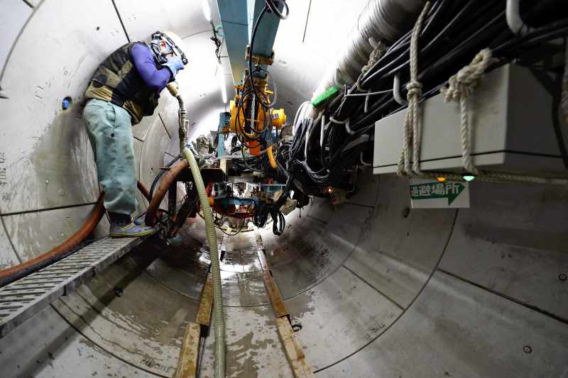 The low motor noise reverberated as we entered the narrow tunnel. The entrance to the tunnel was about 3 meters in diameter. Beyond that was a gentle descent. The interior was surrounded by white reinforced concrete walls and crowded with piping and equipment. Beyond the tunnel, a shield machine was digging into the bedrock, but we could not see it.