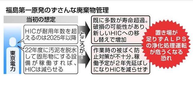 TEPCO initially planned to start operation of a facility capable of disposing of the HIC by the end of this fiscal year. It did not construct a new yard, anticipating that the number of HICs would decrease after the facility went into operation. However, the Nuclear Regulation Authority (NRA) pointed out design flaws, delaying the scheduled operation by more than two years. Lack of contingency plans led to fears of a crunch.