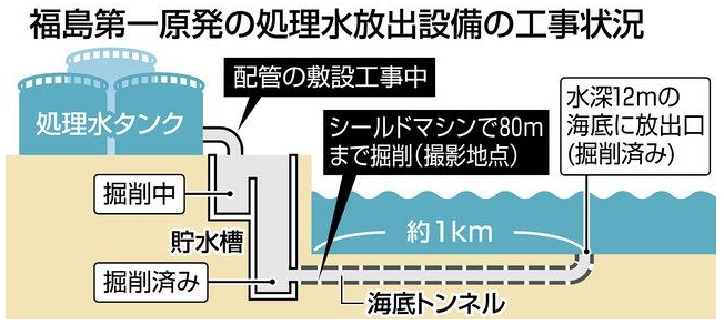 According to TEPCO’s plan, the treated water, which mainly contains radioactive tritium, will be diluted with a large amount of seawater to less than 1/40th of the national emission standard and released from the seafloor at a depth of about 12 meters through a tunnel. (The water will be discharged from the seafloor at a depth of about 12 meters through a tunnel.)