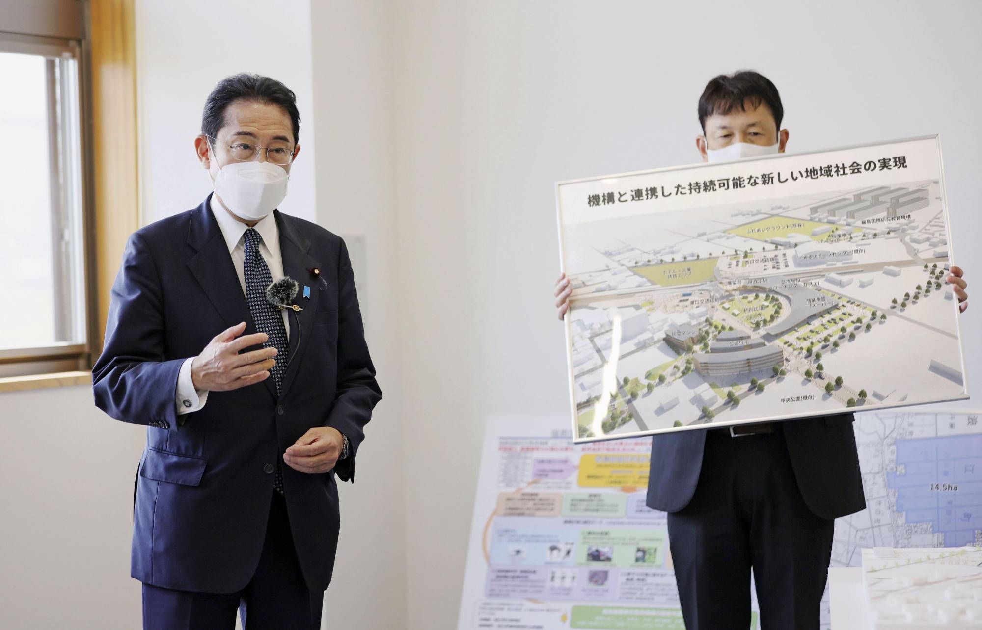 Earlier in the day, Kishida visited a “reconstruction base” zone in the town of Futaba, for which the government recently lifted its nuclear evacuation order issued following the Fukushima No. 1 plant meltdowns. He held talks with Shiro Izawa, mayor of Futaba, one of the two host towns of the nuclear plant, and young town staff members.