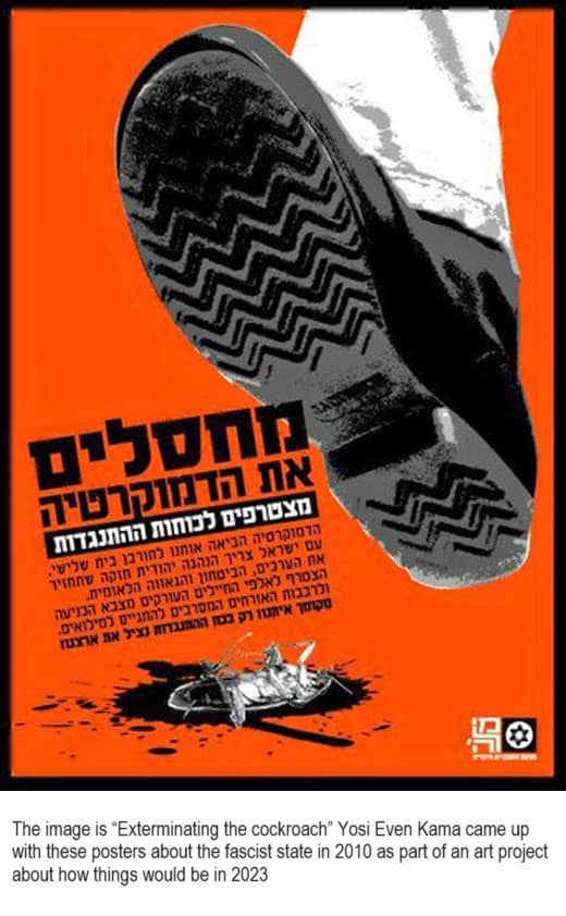 [The image is “Exterminating the cockroach” Yosi Even Kama came up with these posters about the fascist state in 2010 as part of an art project about how things would be in 2023]