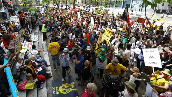 Hundreds march against nuclear dumping in South Australia http://www.9news.com.au/national/2016/10/15/12/51/hundreds-march-against-nuclear-dumping-in-south-australia Hundreds of land owners have converged in Adelaide’s city centre to resist the South Australian government’s plans for two nuclear waste dumps in the state’s north.