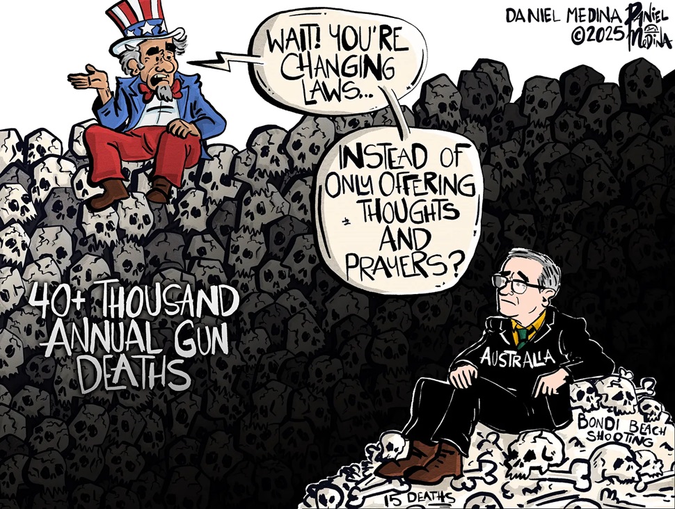 After the devastating massacre at Bondi Beach on Sunday, Australia’s PM and leaders promised to tighten gun laws to help make sure it never happens again. As an American reading this, and hearing more than just “thoughts and prayers,” I sat at my desk and felt deeply sad. Our country is so dysfunctional that we cannot handle even the basics of governing, let alone face the leading cause of death for American children: firearms.