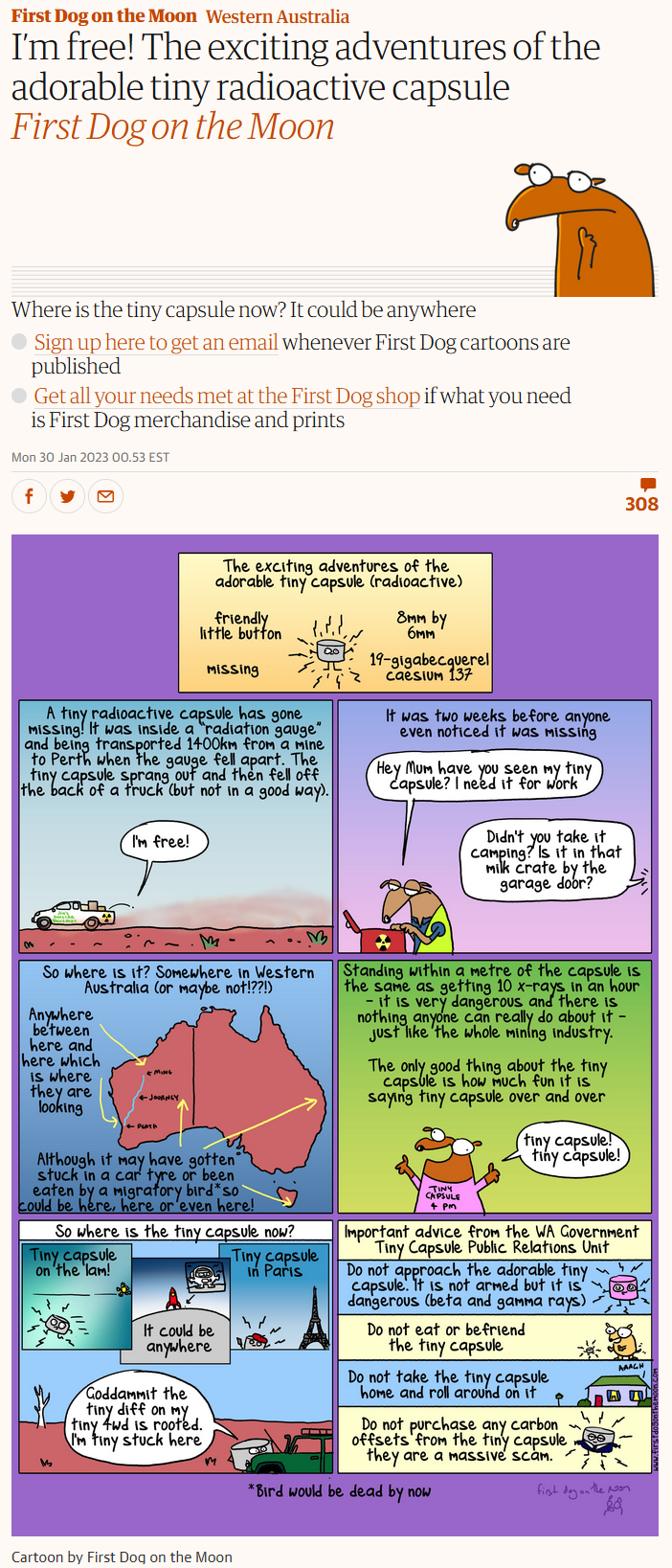 “It was not until the 25th, late morning, when they opened it up to reveal that the device had fallen apart, was damaged in transit, and that the actual capsule was discovered missing, which is when authorities were first notified.” ………… more https://www.theguardian.com/australia-news/2023/jan/28/missing-radioactive-capsule-wa-officials-admit-it-was-weeks-before-anyone-realised-it-was-lost