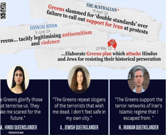 The image features three individuals targeting the Greens as a “divisive hate group” for the represented ethnicities or cultural identities. One of the three is posed as representing a “Jewish Queenslander” who doesn’t feel safe in her own cities because of Greens repeating “slogans of the terrorists that wish [her] dead.”