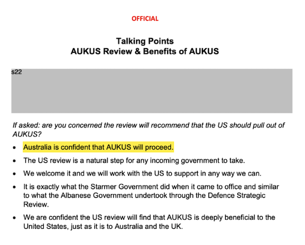We must have a public independent review of AUKUS. We need to consider alternatives that are more cost-effective and in our national interest. Sovereignty matters. Defence secrecy is no excuse, and wishful thinking is very poor strategy. It is time to stop gaslighting the public.