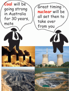 The problem is that, on any realistic analysis, there’s no chance of getting a nuclear plant going in Australia before about 2040 (see over the fold). So, the nuclear fans end up supporting the Abbott crew saying that we will have to rely on coal until then. And to make this case, it is necessary to ignore or denounce the many options for an all-renewable electricity supply, including concentrated solar power, large-scale battery storage and vehicle-to-grid options. As a result, would-be green advocates of nuclear power end up reinforcing the arguments of the coal lobby.