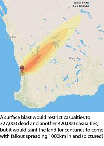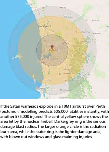 If the Satan warheads explode in a 10MT airburst over Perth, modelling by Nukemap predicts 505,000 fatalities instantly, with another 575,000 injured.