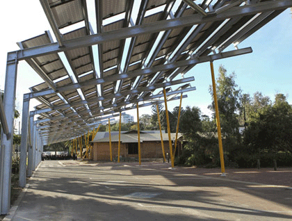While the steel-framed solar pergola is the centrepiece of the Perth Zoo project, it also doubles as a bus shelter, running along the northern perimeter road and propping up 452 solar panels with a power rating of 145kW.